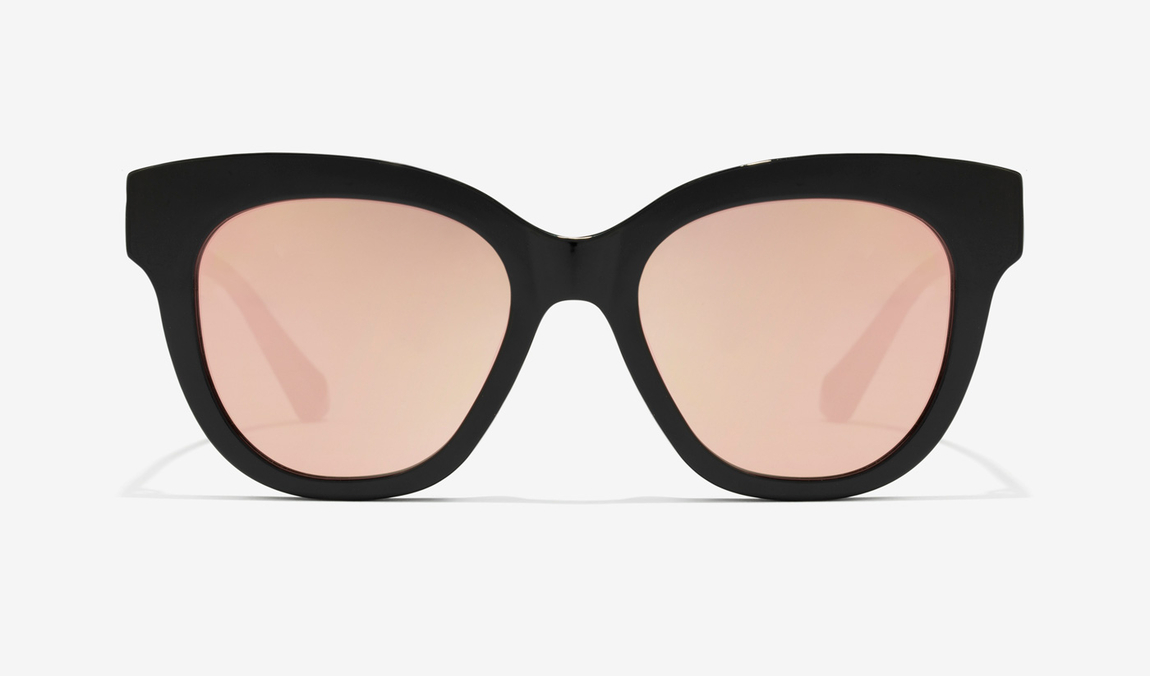Gafas de sol redondas estilo mariposa con montura negra en acabado brillante y lentes de espejo color rosa dorado. Un diseño sofisticado y femenino que recupera las siluetas elegantes de los años 70.