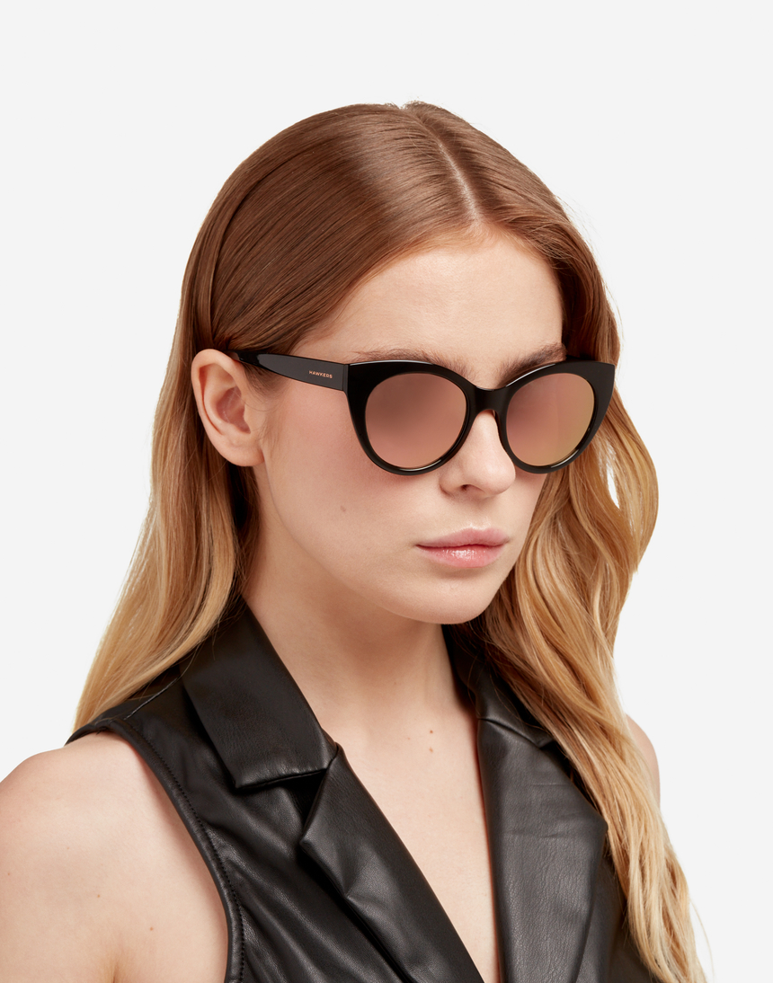 Estas gafas de sol vintage redondas son una reinterpretación nostálgica de las clásicas monturas cat eye. Su diseño negro con puntas pronunciadas en acabado brillante y lentes rosa dorado realzan las líneas femeninas.