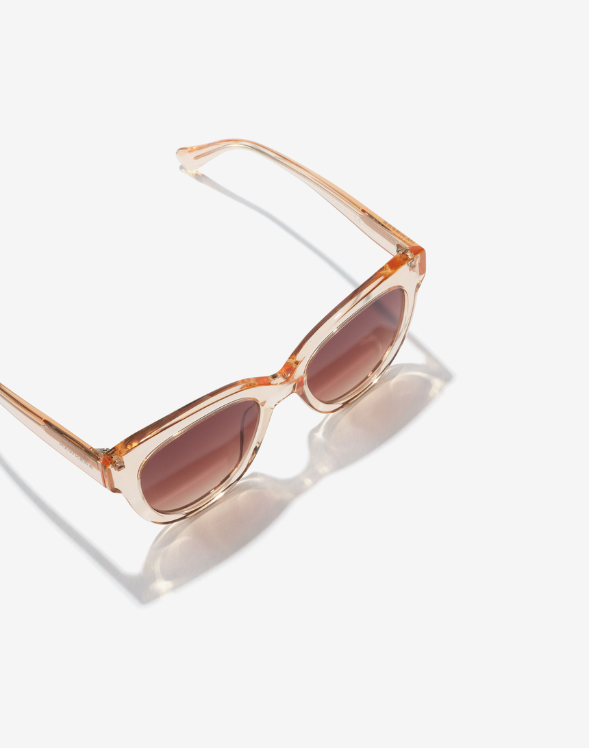 Gafas de sol Hawkers estilo mariposa que recuperan las líneas sofisticadas y femeninas de los años 70. Montura transparente en color champán con lentes marrones degradas categoría 3 y protección UV400.