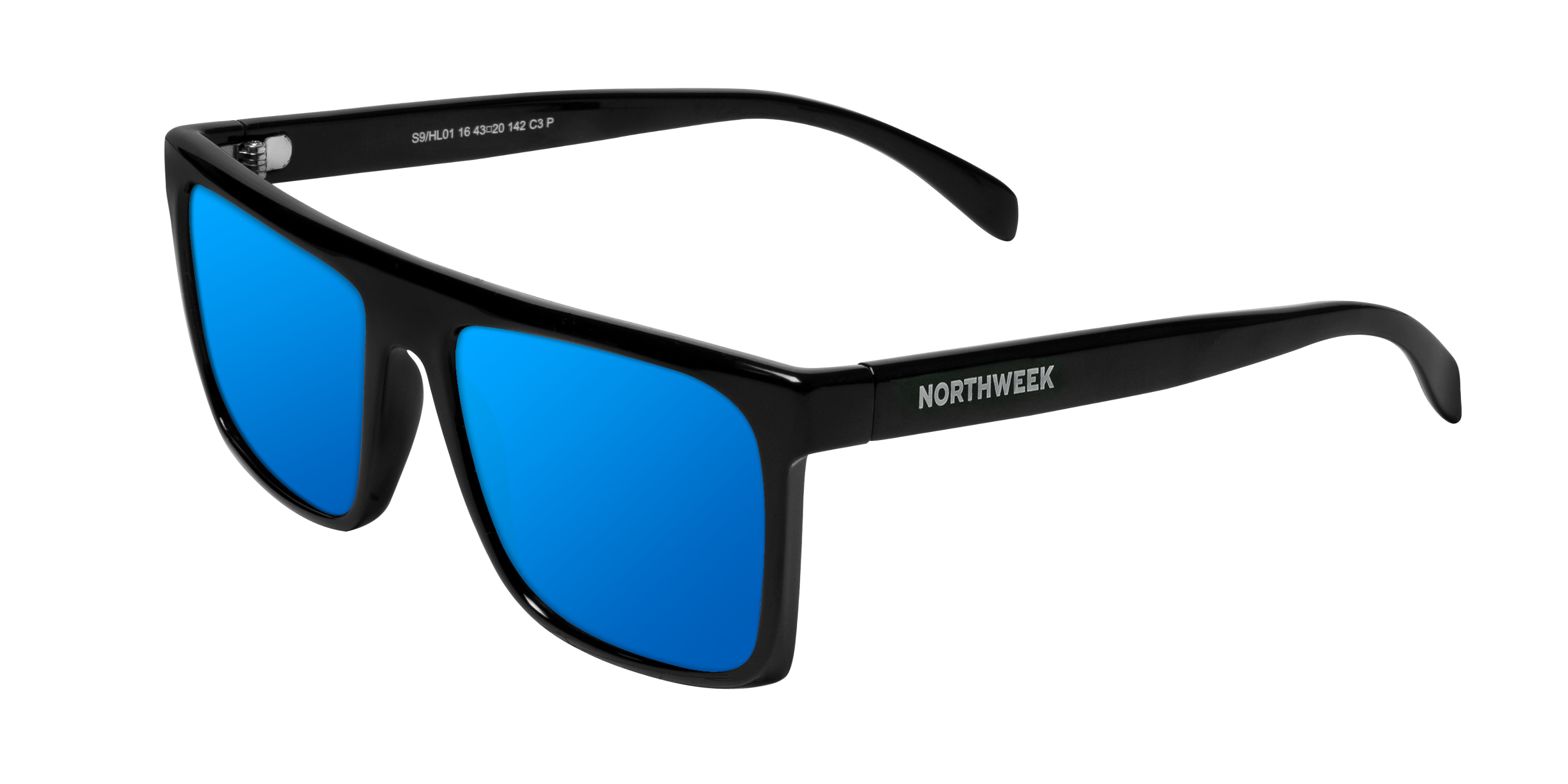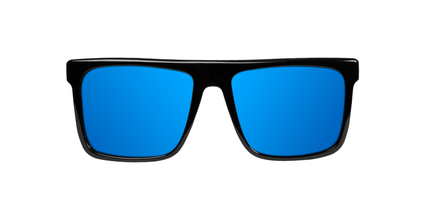 Montura cuadrada ligeramente oversize de color negro brillante y lentes espejadas de color azul