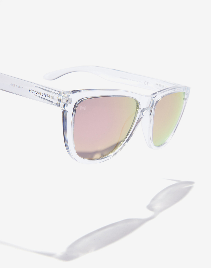 ONE es nuestro diseño más icónico de todos los tiempos. Este modelo, de la colección Made in Spain, combina montura transparente y lentes espejadas color rose gold.