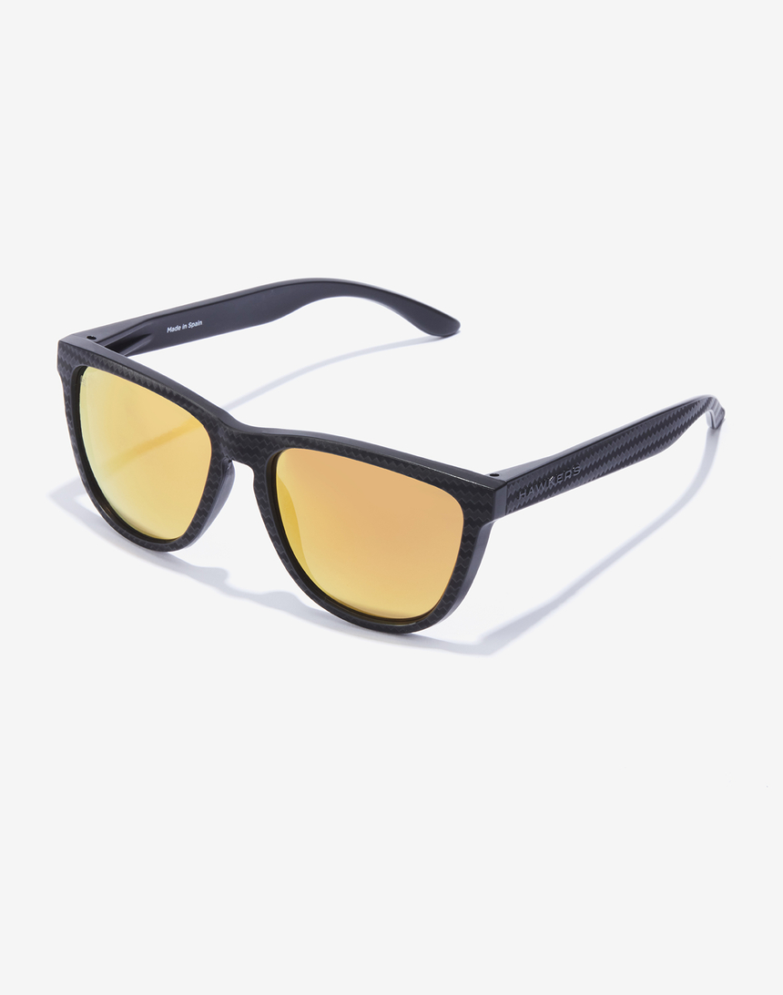 ONE es nuestro best seller atemporal, y las monturas negras son sin duda las más populares. Este modelo negro, de la línea Made in Spain, tiene un efecto de grafito brillante en diagonal (lo que llamamos CARBONO) en la parte frontal de los aros y los exteriores de las patillas. Los bordes de la montura tienen un acabado suavizado mate, que acentúa aún más el efecto CARBONO. Las lentes POLARIZADAS son de color naranja iridiscente con efecto espejo.