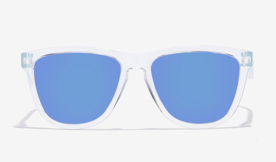 ONE es nuestro diseño más icónico de todos los tiempos. Este modelo, de la colección Made in Spain, tiene una montura transparente brillante con logos plateados en las patillas y lentes POLARIZADAS espejadas de color azul celeste.