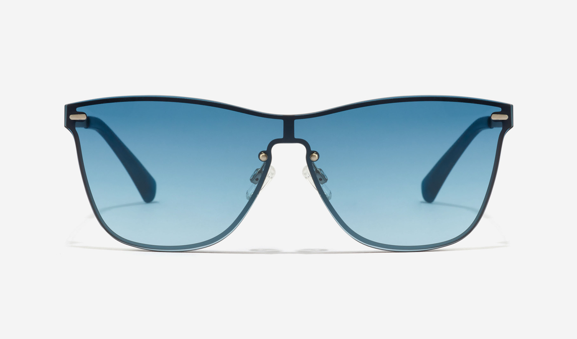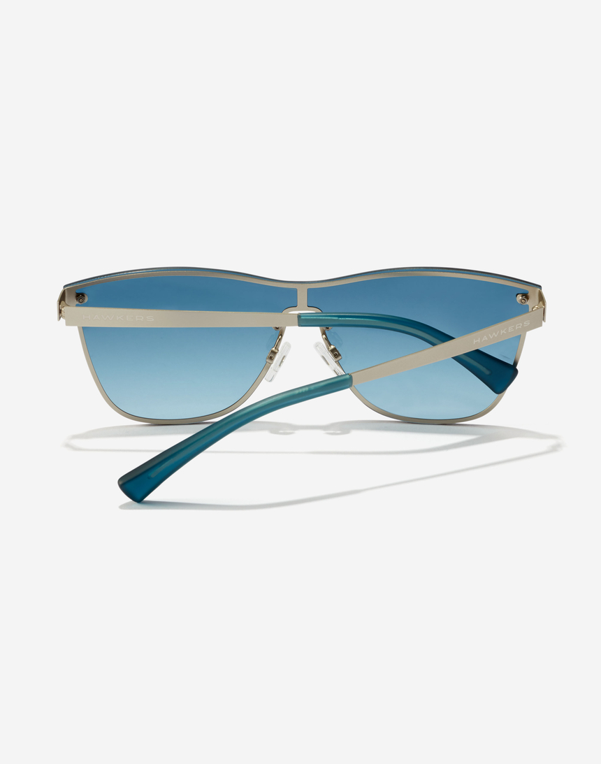 Un diseño todo lente en tono azul denim con estructura metálica plateada en acabado mate y terminales azul denim.